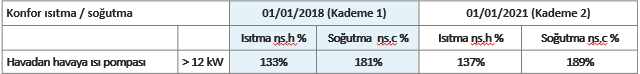 Tablo 1: Havadan havaya ısı pompaları için iki kademeli olarak belirlenen minimum ısıtma ve soğutma verimlilikleri