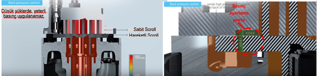 Düşük yük işletimi sırasında ortaya çıkabilecek en önemli sorun, yüksek basınç tarafından alçak basınç tarafına soğutucu akışkan sızması ve buna bağlı verimlilik kaybı yaşanmasıdır. Ortaya çıkan bu sorunun nedeni, kompresörün hareketli kısmının(hareketli scroll) sabit kısmına(sabit scroll) yeterince basınç uygulayamamasıdır.Daikin, geliştirdiği yeni kompresörün sahip olduğu “basınç ayarlama portu” ile bu soruna çözüm getirmiştir(Şekil 2).