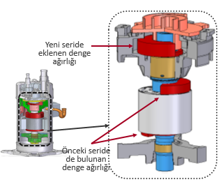 Yeni jenerasyon kompresörde eklenen ağırlık, sıkıştırma işlemi sırasında oluşan merkezkaç kuvvetinin etkisini ortadan kaldırmaya katkı sağlar.